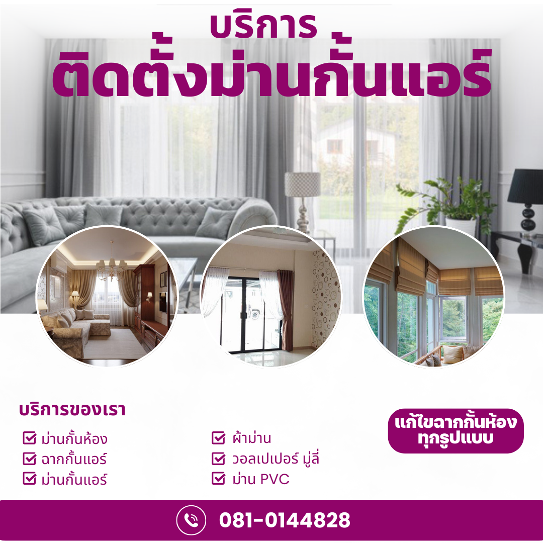 ติดตั้งผ้าม่านใกล้ฉัน มู่ลี่ วอลล์เปเปอร์ ม่านปรับแสง ฉากกั้นแอร์ ม่านม้วน ม่านปรับแสง พร้อมประเมิณราคาถึงบ้าน บริการติดฉากกั้นห้อง ฉากกั้นแอร์วอลเปเปอร์ บ้าน คอนโดฯลฯ